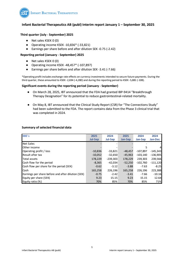 IBT continues its intensive work towards market approval of IBP-9414. During the period, we have interacted with Europe (EMA) and the US (FDA). Earlier this year we registered as a Small Medium Enterprises (SME) with the EMA and during this quarter, announced that IBT intends to seek central marketing approval in Europe in 2026. In March this year, IBP-9414 was granted Breakthrough Therapy Designation in the US. In early summer, we followed this up by submitting the “totality of evidence”, i.e. the clinical information as a supplement to our Investigational New Drug (IND) application. During the period from July 1 to today, the FDA and IBT have communicated in writing several times. Among other things, IBT has received statistical and medical questions about the clinical data. We receive questions and follow-up questions, and the FDA wants answers within 24 or 48 hours. US law requires a formal Biological License Application (BLA) from IBT for the FDA to communicate the results of its review. The FDA can thus review under an IND, but in order for the FDA to approve IBP-9414, a BLA is required. IBT plans therefore to submit a BLA during first half of 2026.