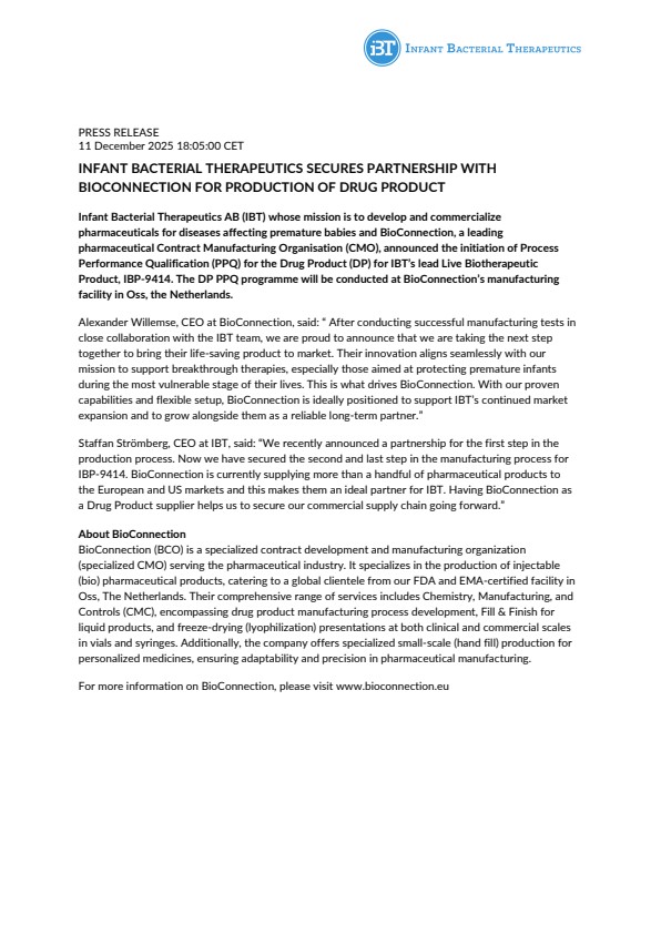 Alexander Willemse, CEO at BioConnection, said: “ After conducting successful manufacturing tests in close collaboration with the IBT team, we are proud to announce that we are taking the next step together to bring their life-saving product to market. Their innovation aligns seamlessly with our mission to support breakthrough therapies, especially those aimed at protecting premature infants during the most vulnerable stage of their lives. This is what drives BioConnection. With our proven capabilities and flexible setup, BioConnection is ideally positioned to support IBT’s continued market expansion and to grow alongside them as a reliable long-term partner.”
