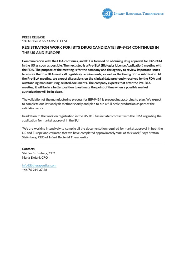 “We are working intensively to compile all the documentation required for market approval in both the US and Europe and estimate that we have completed approximately 90% of this work,” says Staffan Strömberg, CEO of Infant Bacterial Therapeutics.