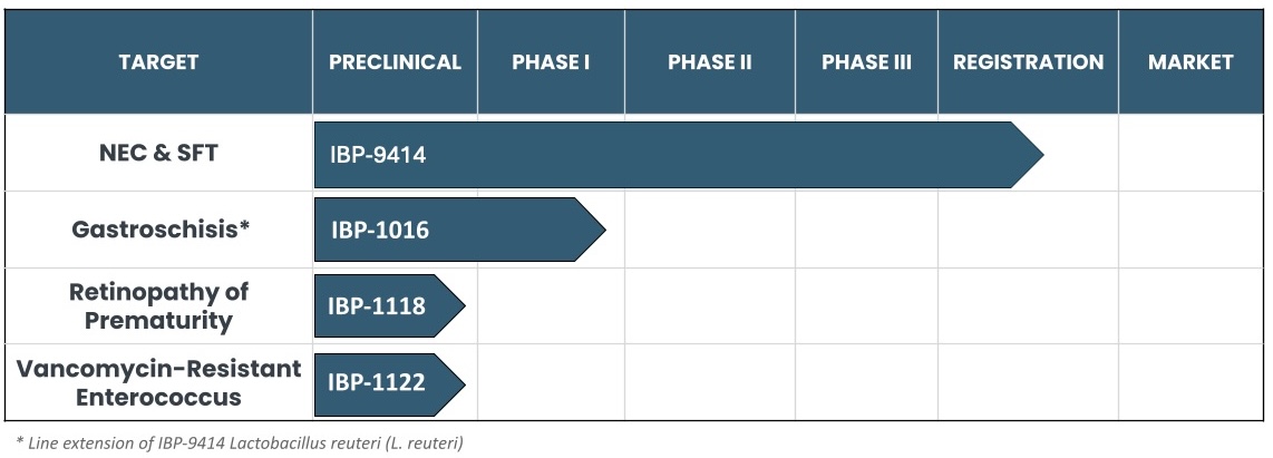 IBT’s current lead drug candidate is IBP-9414 is the first ever New Biological Entity (NBE) developed to prevent necrotizing enterocolitis in premature infants and improve their sustained feeding tolerance. IBP-9414 is currently being evaluated in a global phase III study involving 2158 infants with a birthweight between 500g-1500g, the Connection Study (more information can be found at ClinicalTrials.gov Identifier: NCT03978000). IBP-9414 contains the active substance Lactobacillus reuteri, a human bacterial strain naturally present in breast milk. Read more about the research involving Connection Study, NEC, and SFT in the IBP-9414 specific section.